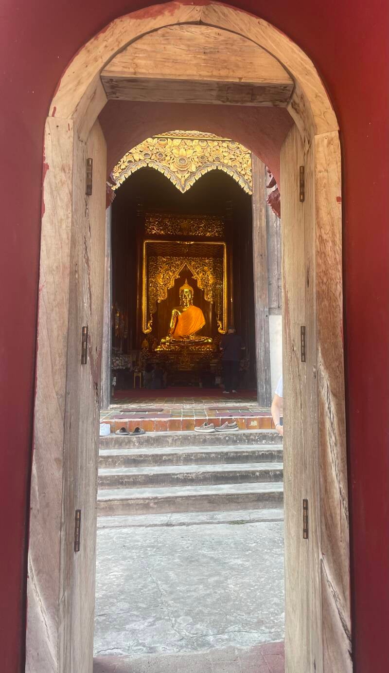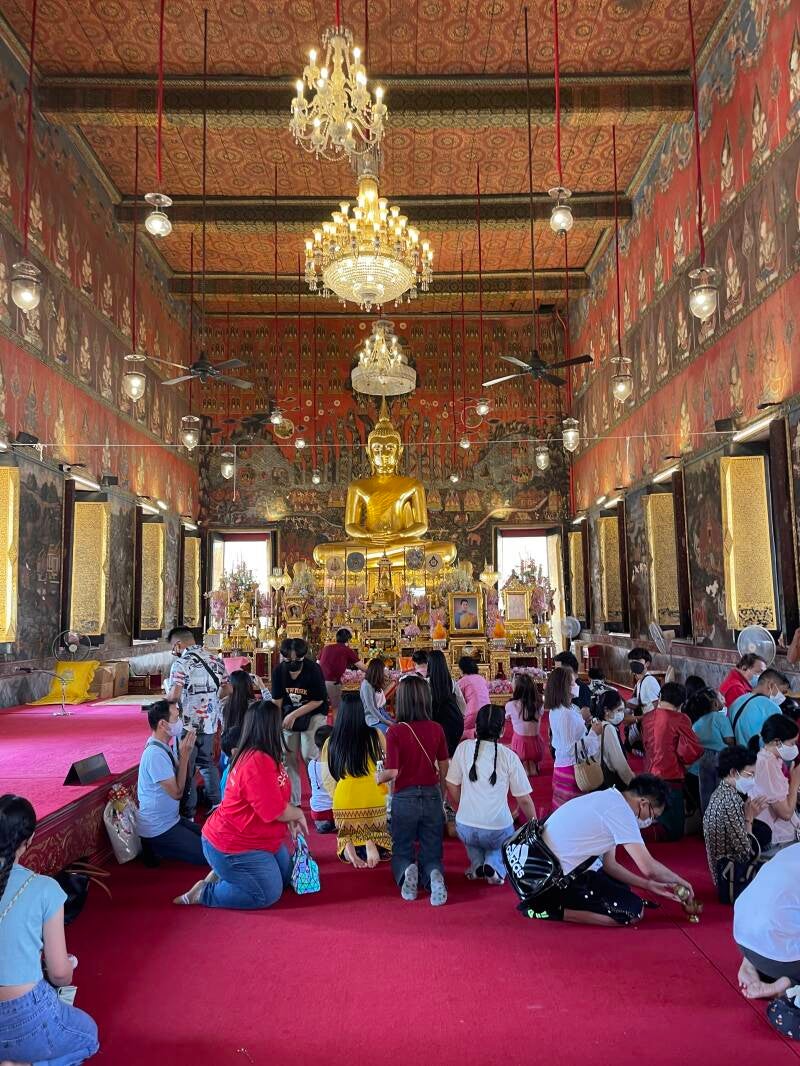 In de tempel waren monniken mensen aan het zegenen. Geknield gingen mensen richting de Boeddha, daarna gaven ze cadeaus aan de monniken en liepen de deur uit.