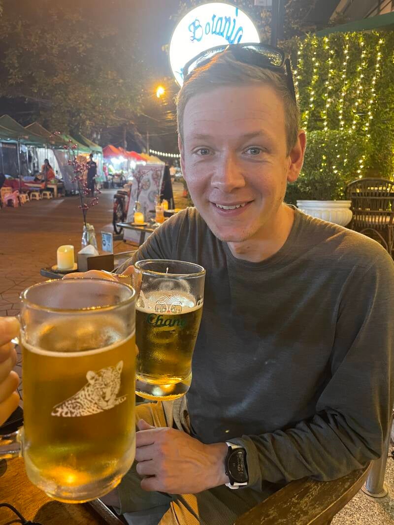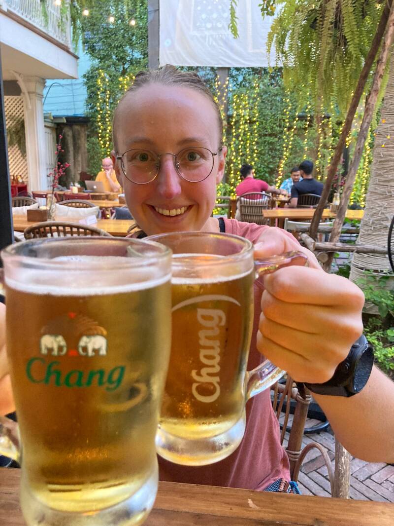 Op de Khoa San road, waar we pas 700x geweest zijn in deze drie dagen, kochten Casper en ik beide een kokosnoot ijsje. Gister was deze erg goed bevallen. Bij de botanic backyard zaten we te relaxen met een biertje. Een perfecte afsluiter van de dag.