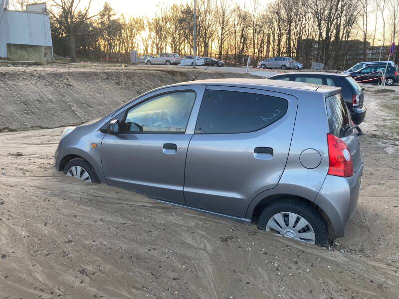Uit checken en de bordjes volgen naar de P&R van station Ede-Wageningen. We zagen een enorme plas. Hopelijk staat onze auto daar niet in. We lopen het heuveltje over en zien onze auto in een veel ergere staat. Die van ons staat begraven in de modder. Een gedeelte van de bumper en halverwege de wielen staan we vast.