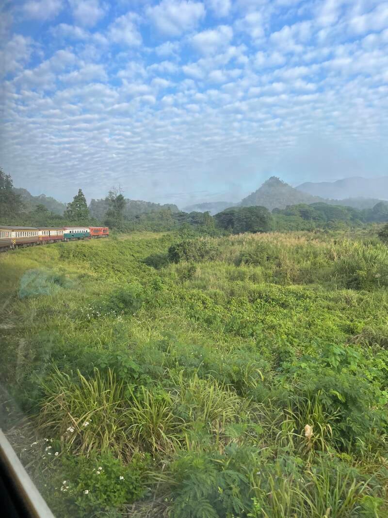 Na een nacht heen en weer hobbelend slapen, werd ik wakker in de trein. We waren opeens in de jungle beland. Bamboo, huizen op palen van de grond af, groene, dicht beboste bergen. Bij elk dorp bananenplanten.