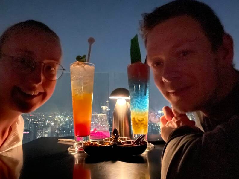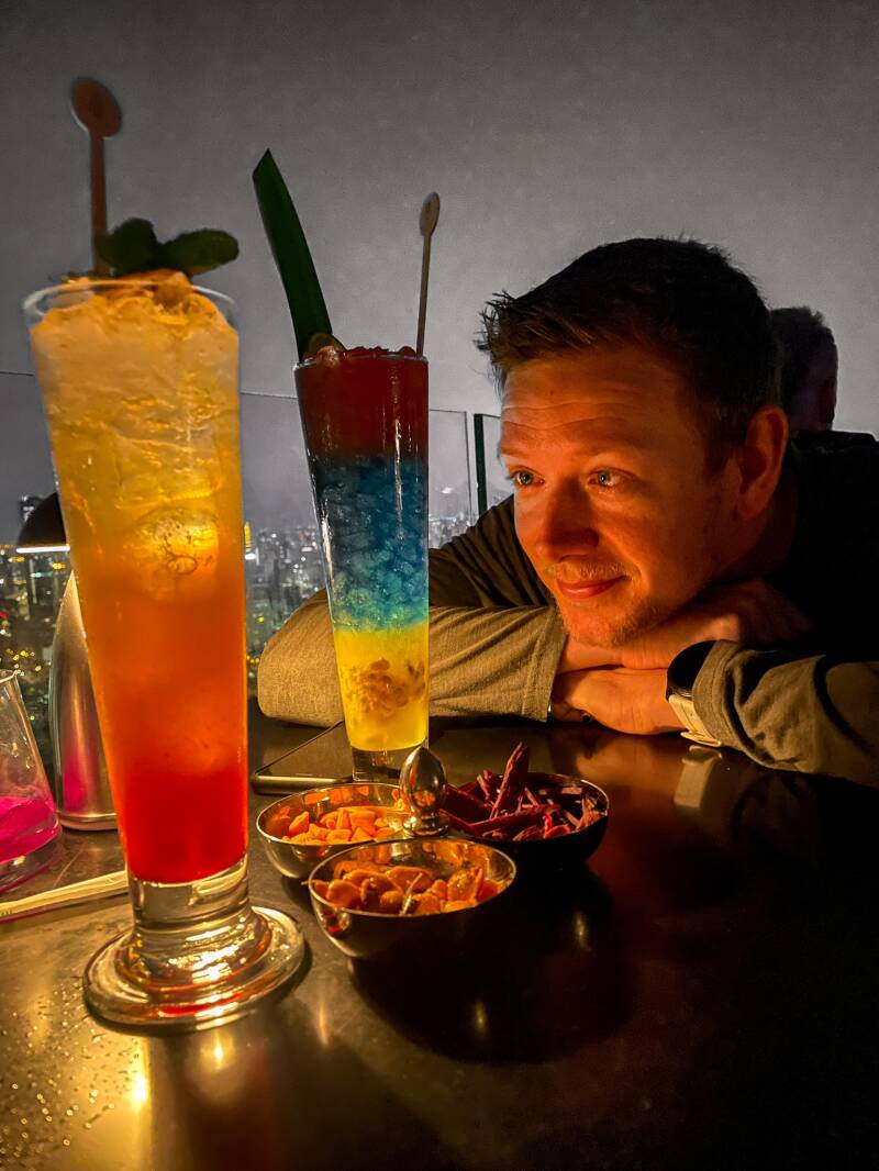 Voor een drankje hoefde we geen reservering te hebben, dus mochten we naar het hogere dak terras lopen. Op het moment dat we langs liepen ging net iemand weg bij een tafeltje. Ik trok Casper mee aan z’n arm en ging snel zitten. Het was een tafeltje aan de beste kant van het terras. We hadden een prachtig uitzicht direct naast de afgrond. Lichtjes knipperde, auto’s reden beneden langs en Bangkok straalde rust uit vanuit de lucht. De drukte als een soort bewegend kunstwerk.
