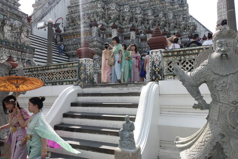We liepen een rondje, bekeken de gebouwen, maar ook vooral de mensen. Hier waren veel mensen van Aziatische afkomst uitgedost voor foto’s op pad. Prachtige traditionele kleding die goed bij de kleurrijke tempel past.