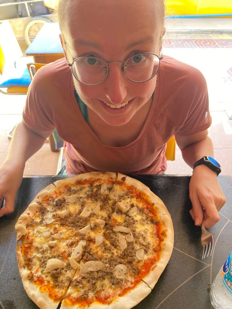 We liepen met al onze bagage door de hitte naar een restaurantje. Waar ik gister mijn frustratie schreef over het toerisme op Koh Phi Phi, kocht ik hier voor het eerst in twee weken een pizza als lunch. Caspers pizza ging in 1x goed, bij mij gaven ze eerst de verkeerde.