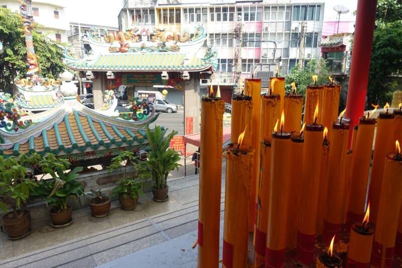 Kort parkeerde we de fiets bij een Chinees boeddhistische tempel. Snoeker (een van de gidsen) ging water halen, terwijl Prem (de andere gids) vertelde over het Chinese boeddhisme.