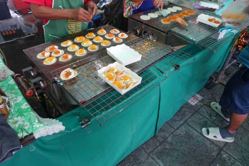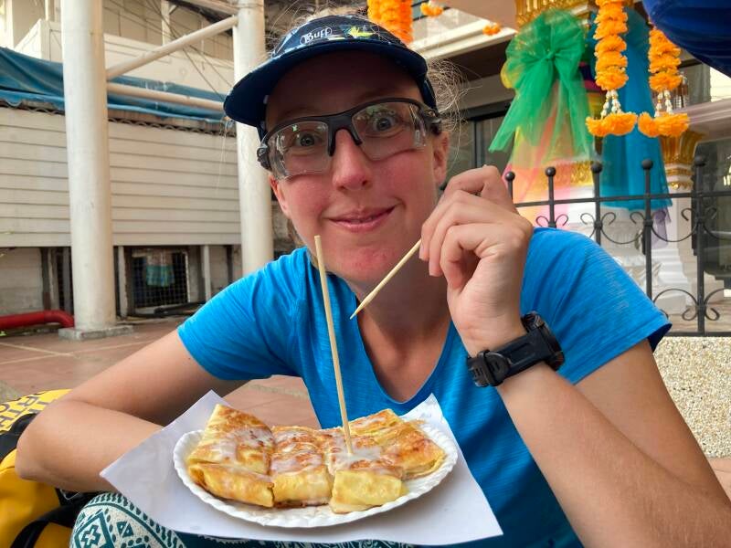 Na de massage kochten we de laatste dingen die we nog echt heel graag wouden eten voor we naar de luchthaven gingen. Een Thaise pannenkoek met banaan en ei met gecondenseerde melk erover.